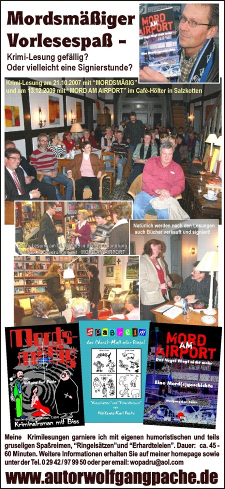 Wenn Sie als Buchhändler oder Veranstalter oder Restaurantbetreiber oder Kulturschaffender Interesse an einer Lesung haben, sprechen Sie mich einfach an, ich bin für jede gute Idee zu haben...