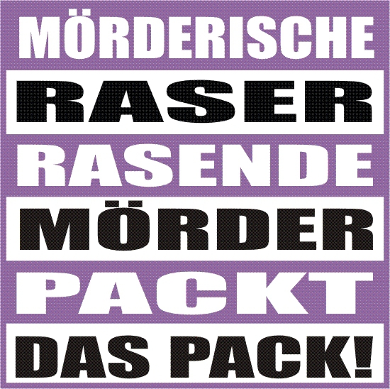 Jetzt ist es auch gerichtlich amtlich: Raser sind Mörder, rasende Mörder sind krank an Geist und Seele. Raser werden in Zukunft einpacken können, weil dieses Pack auf den Straßen keiner mehr haben will. Selbst die Packesel der Nation (Paketdienste) werden wohl nur als Stromer durch die Straßen fahren. Die neuen Raser auf den Radwegen sind die Ebikes, rentnerbepackt oder muskelbepackte Extremsportler mit elektrischem Düsenantrieb. Aber Ebikes bringen mich nicht um, höchstens den Mountainbiker, der sich auf seinen mörderischen Abfahrten mit Rückenwind den Hals bricht. Wer sich unbedingt totfahren will, soll und wird das auch tun. Auf den Beipackzetteln dieser Adrenalinaufputschmittel sollte dick und fett geschrieben stehen: Macht das aber bitte unter Euch oder allein aus...